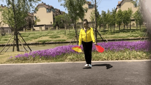 左脚向前走4拍,举左手开扇;右脚向后4步,举右手开扇;