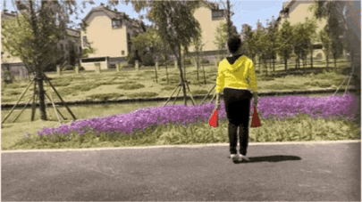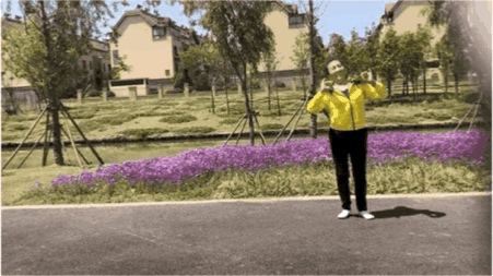 背朝一点双手搭肩,左右移步,然后转身至一点秧歌步;双手搭肩,左右移步,5至8拍同上。