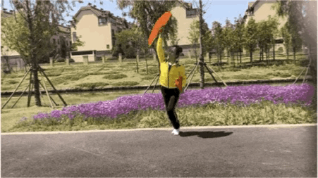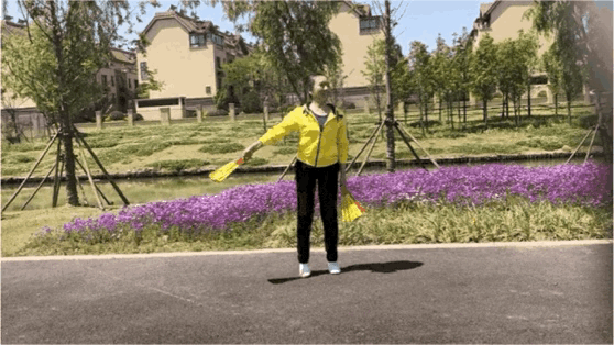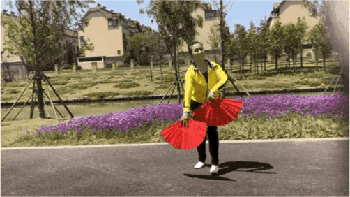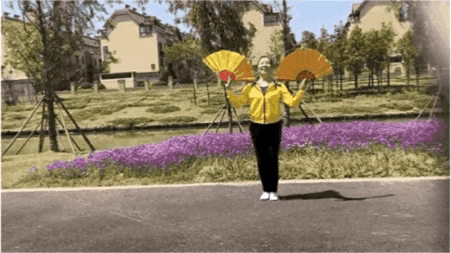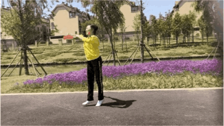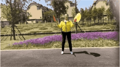 在原地踩至第8拍时右手扇子划至胸前;