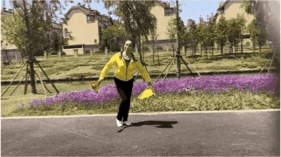 双手提扇往右搓跳步,5至8拍双手搭肩往左钩脚移步;左右手交替画圆,然后朝五点跑跳步。
